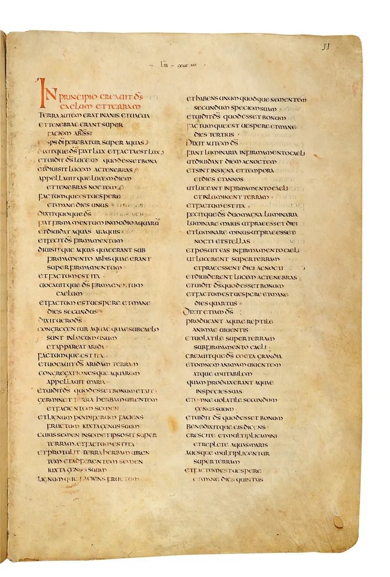Folio of the Codex Amiatinus, the oldest surviving complete Latin Vulgate manuscript, made c. 700 AD at the twin Northumbrian monasteries of Monkwearmouth and Jarrow under Abbot Ceolfrith. Approximately corresponds to Genesis 11 in Vulgate book order. The page shows the actual eighth-century insular-uncial script as it would have been read by the monks who produced it for Pope Gregory II.