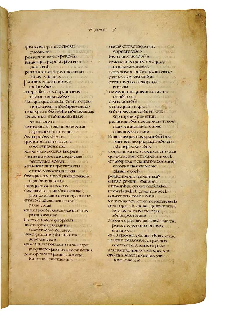 Folio of the Codex Amiatinus, the oldest surviving complete Latin Vulgate manuscript, made c. 700 AD at the twin Northumbrian monasteries of Monkwearmouth and Jarrow under Abbot Ceolfrith. Approximately corresponds to Genesis 13 in Vulgate book order. The page shows the actual eighth-century insular-uncial script as it would have been read by the monks who produced it for Pope Gregory II.