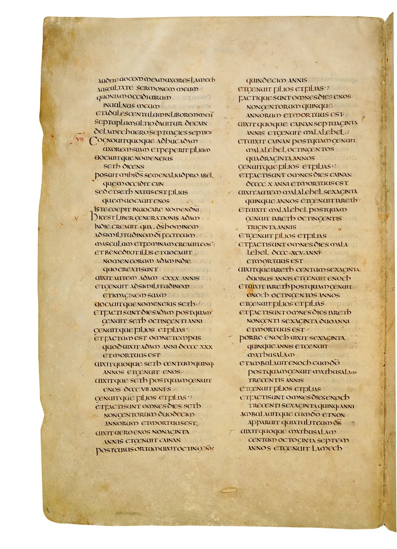 Folio of the Codex Amiatinus, the oldest surviving complete Latin Vulgate manuscript, made c. 700 AD at the twin Northumbrian monasteries of Monkwearmouth and Jarrow under Abbot Ceolfrith. Approximately corresponds to Genesis 14 in Vulgate book order. The page shows the actual eighth-century insular-uncial script as it would have been read by the monks who produced it for Pope Gregory II.