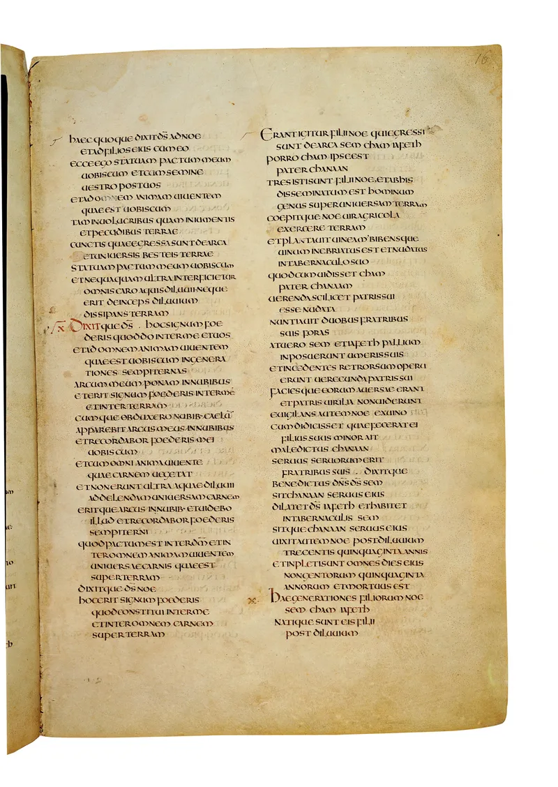 Folio of the Codex Amiatinus, the oldest surviving complete Latin Vulgate manuscript, made c. 700 AD at the twin Northumbrian monasteries of Monkwearmouth and Jarrow under Abbot Ceolfrith. Approximately corresponds to Genesis 17 in Vulgate book order. The page shows the actual eighth-century insular-uncial script as it would have been read by the monks who produced it for Pope Gregory II.