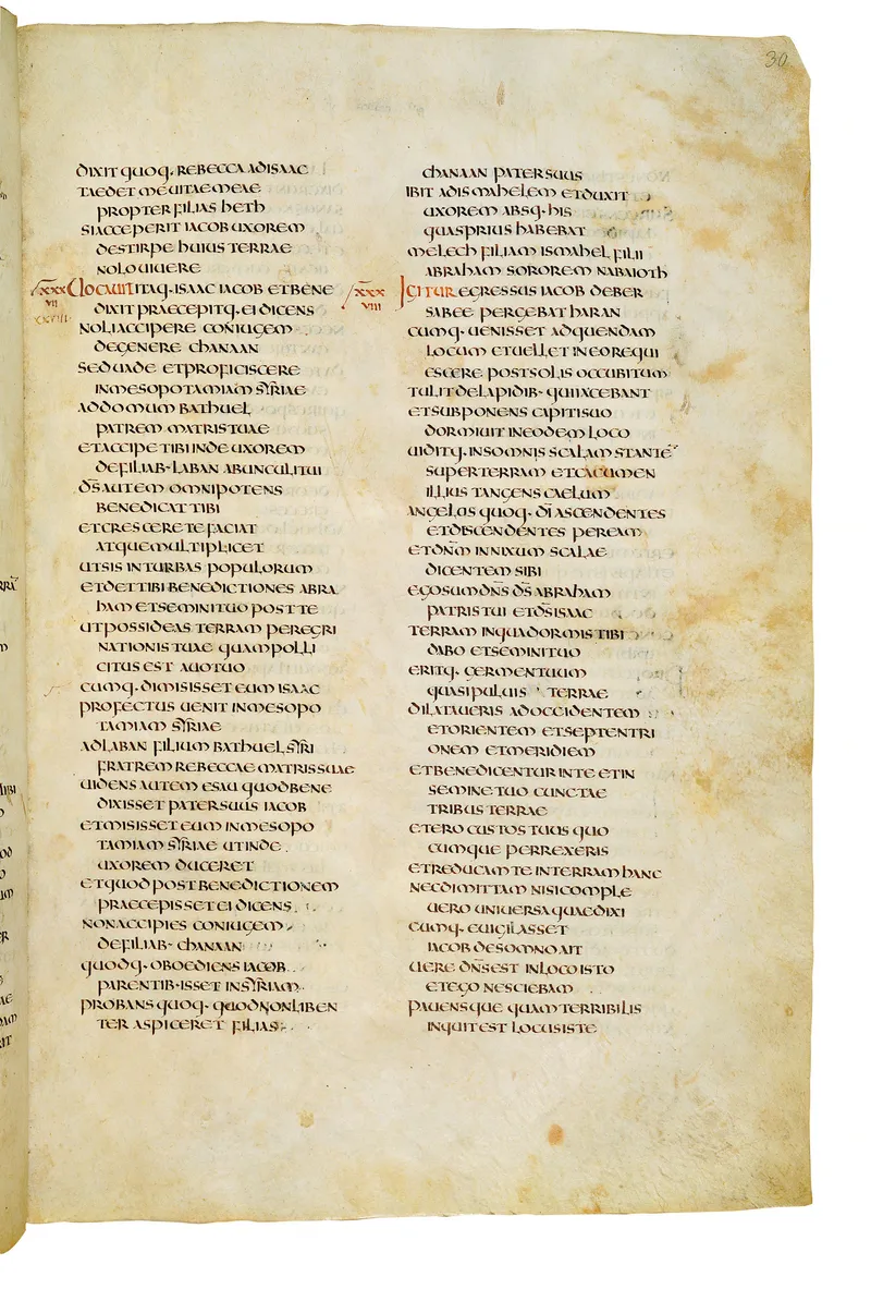 Folio of the Codex Amiatinus, the oldest surviving complete Latin Vulgate manuscript, made c. 700 AD at the twin Northumbrian monasteries of Monkwearmouth and Jarrow under Abbot Ceolfrith. Approximately corresponds to Genesis 35 in Vulgate book order. The page shows the actual eighth-century insular-uncial script as it would have been read by the monks who produced it for Pope Gregory II.