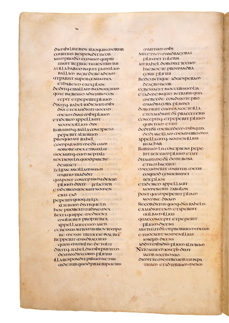 Folio of the Codex Amiatinus, the oldest surviving complete Latin Vulgate manuscript, made c. 700 AD at the twin Northumbrian monasteries of Monkwearmouth and Jarrow under Abbot Ceolfrith. Approximately corresponds to Genesis 37 in Vulgate book order. The page shows the actual eighth-century insular-uncial script as it would have been read by the monks who produced it for Pope Gregory II.
