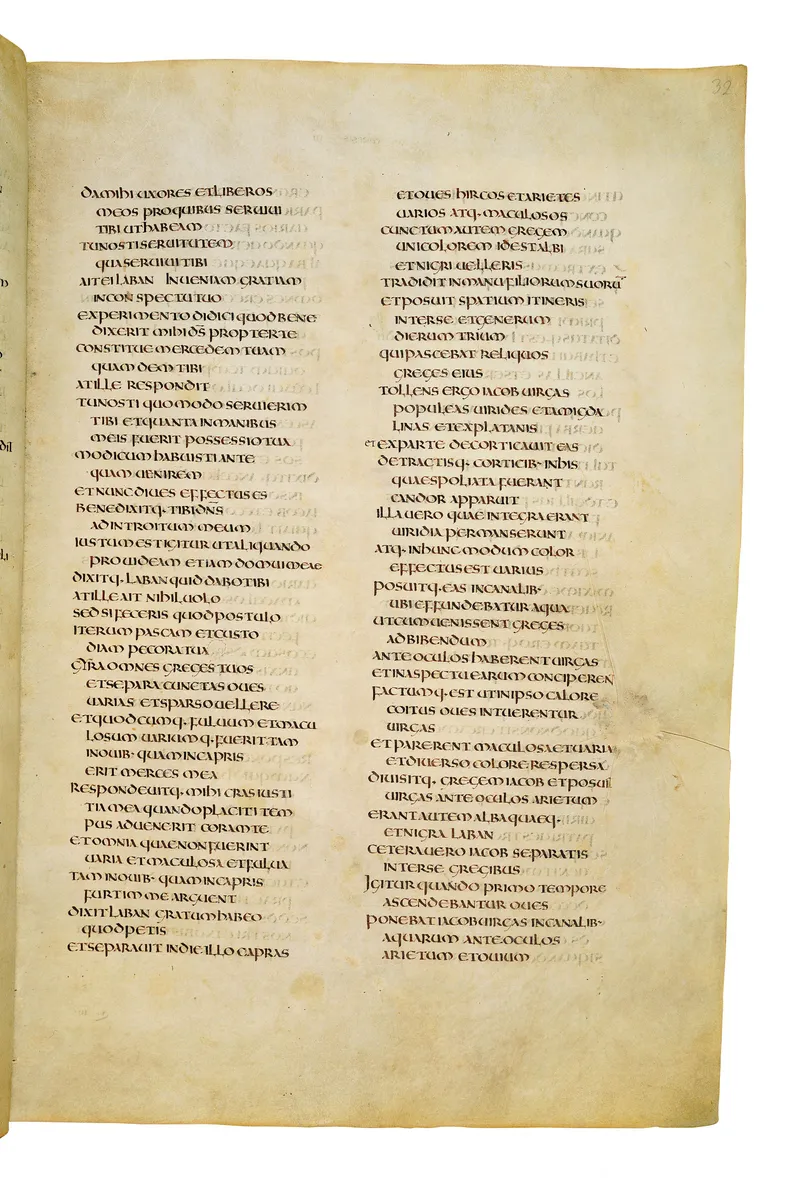 Folio of the Codex Amiatinus, the oldest surviving complete Latin Vulgate manuscript, made c. 700 AD at the twin Northumbrian monasteries of Monkwearmouth and Jarrow under Abbot Ceolfrith. Approximately corresponds to Genesis 38 in Vulgate book order. The page shows the actual eighth-century insular-uncial script as it would have been read by the monks who produced it for Pope Gregory II.