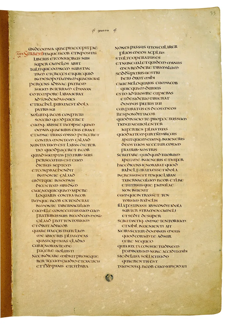 Folio of the Codex Amiatinus, the oldest surviving complete Latin Vulgate manuscript, made c. 700 AD at the twin Northumbrian monasteries of Monkwearmouth and Jarrow under Abbot Ceolfrith. Approximately corresponds to Genesis 39 in Vulgate book order. The page shows the actual eighth-century insular-uncial script as it would have been read by the monks who produced it for Pope Gregory II.