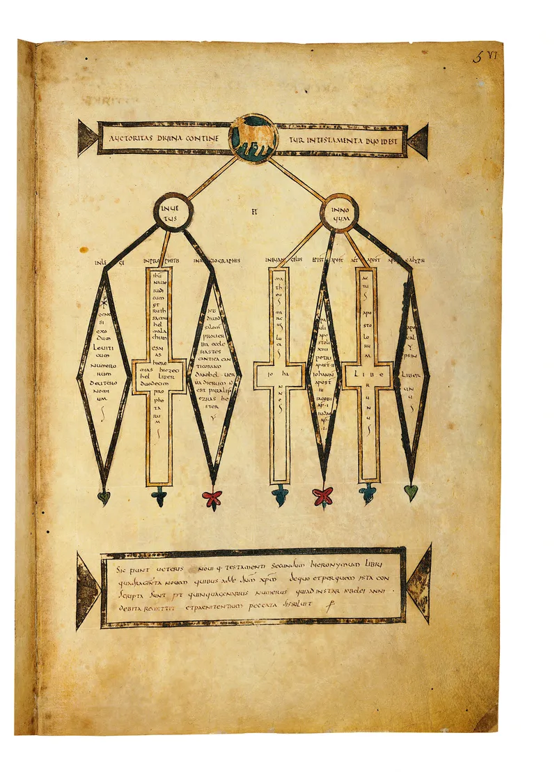 Folio of the Codex Amiatinus, the oldest surviving complete Latin Vulgate manuscript, made c. 700 AD at the twin Northumbrian monasteries of Monkwearmouth and Jarrow under Abbot Ceolfrith. Approximately corresponds to Genesis 4 in Vulgate book order. The page shows the actual eighth-century insular-uncial script as it would have been read by the monks who produced it for Pope Gregory II.