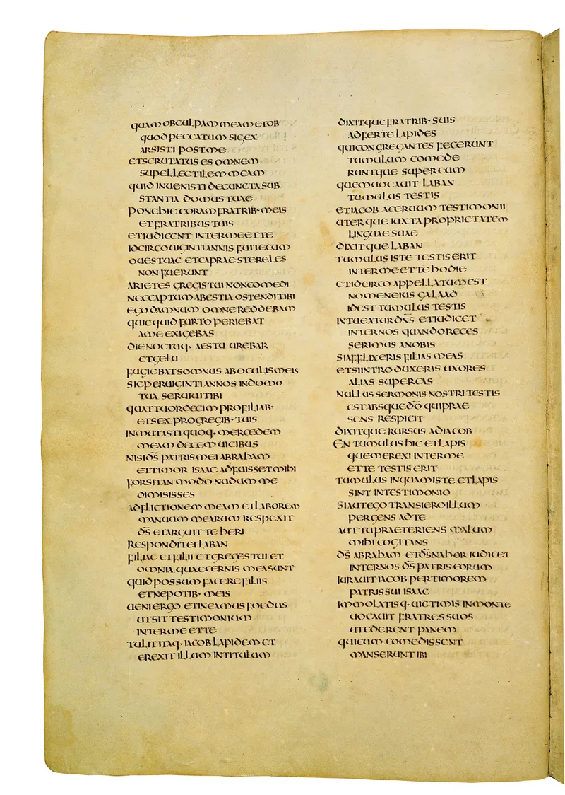 Folio of the Codex Amiatinus, the oldest surviving complete Latin Vulgate manuscript, made c. 700 AD at the twin Northumbrian monasteries of Monkwearmouth and Jarrow under Abbot Ceolfrith. Approximately corresponds to Genesis 40 in Vulgate book order. The page shows the actual eighth-century insular-uncial script as it would have been read by the monks who produced it for Pope Gregory II.