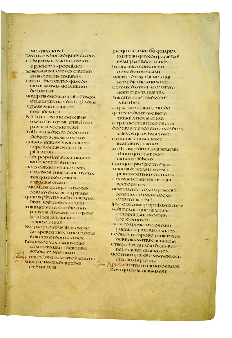 Folio of the Codex Amiatinus, the oldest surviving complete Latin Vulgate manuscript, made c. 700 AD at the twin Northumbrian monasteries of Monkwearmouth and Jarrow under Abbot Ceolfrith. Approximately corresponds to Genesis 43 in Vulgate book order. The page shows the actual eighth-century insular-uncial script as it would have been read by the monks who produced it for Pope Gregory II.