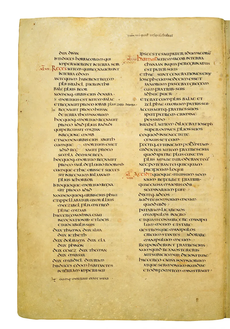 Folio of the Codex Amiatinus, the oldest surviving complete Latin Vulgate manuscript, made c. 700 AD at the twin Northumbrian monasteries of Monkwearmouth and Jarrow under Abbot Ceolfrith. Approximately corresponds to Genesis 45 in Vulgate book order. The page shows the actual eighth-century insular-uncial script as it would have been read by the monks who produced it for Pope Gregory II.