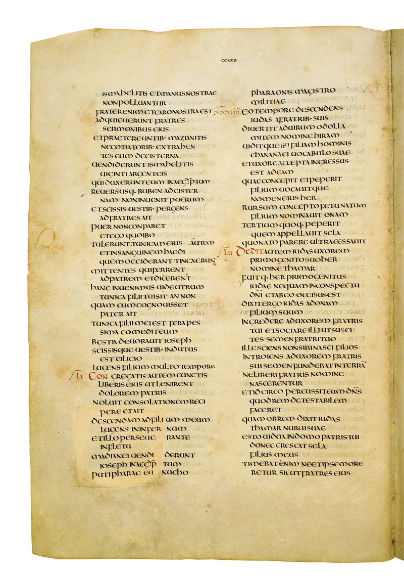 Folio of the Codex Amiatinus, the oldest surviving complete Latin Vulgate manuscript, made c. 700 AD at the twin Northumbrian monasteries of Monkwearmouth and Jarrow under Abbot Ceolfrith. Approximately corresponds to Genesis 46 in Vulgate book order. The page shows the actual eighth-century insular-uncial script as it would have been read by the monks who produced it for Pope Gregory II.