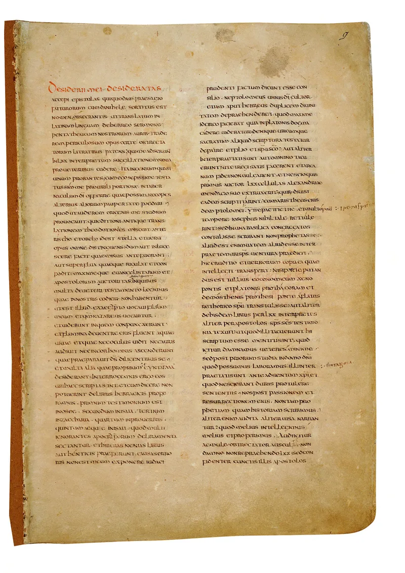 Folio of the Codex Amiatinus, the oldest surviving complete Latin Vulgate manuscript, made c. 700 AD at the twin Northumbrian monasteries of Monkwearmouth and Jarrow under Abbot Ceolfrith. Approximately corresponds to Genesis 8 in Vulgate book order. The page shows the actual eighth-century insular-uncial script as it would have been read by the monks who produced it for Pope Gregory II.