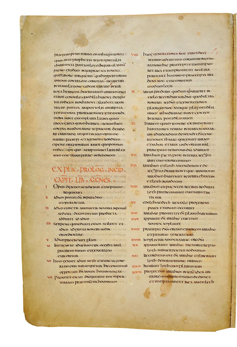Folio of the Codex Amiatinus, the oldest surviving complete Latin Vulgate manuscript, made c. 700 AD at the twin Northumbrian monasteries of Monkwearmouth and Jarrow under Abbot Ceolfrith. Approximately corresponds to Genesis 9 in Vulgate book order. The page shows the actual eighth-century insular-uncial script as it would have been read by the monks who produced it for Pope Gregory II.