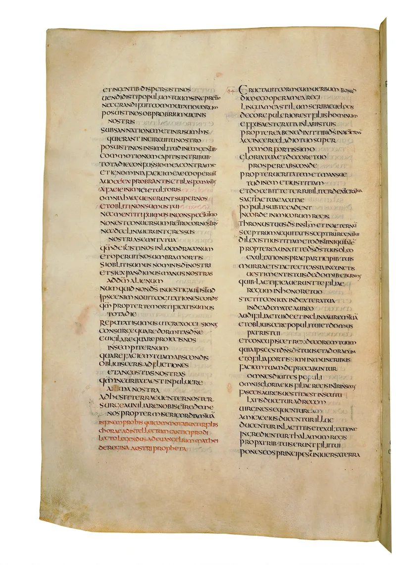 Folio of the Codex Amiatinus, the oldest surviving complete Latin Vulgate manuscript, made c. 700 AD at the twin Northumbrian monasteries of Monkwearmouth and Jarrow under Abbot Ceolfrith. Approximately corresponds to Job 35 in Vulgate book order. The page shows the actual eighth-century insular-uncial script as it would have been read by the monks who produced it for Pope Gregory II.