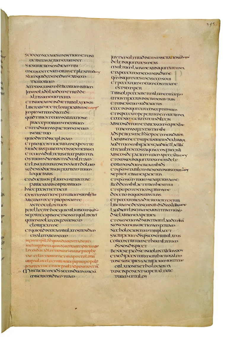 Folio of the Codex Amiatinus, the oldest surviving complete Latin Vulgate manuscript, made c. 700 AD at the twin Northumbrian monasteries of Monkwearmouth and Jarrow under Abbot Ceolfrith. Approximately corresponds to Job 37 in Vulgate book order. The page shows the actual eighth-century insular-uncial script as it would have been read by the monks who produced it for Pope Gregory II.