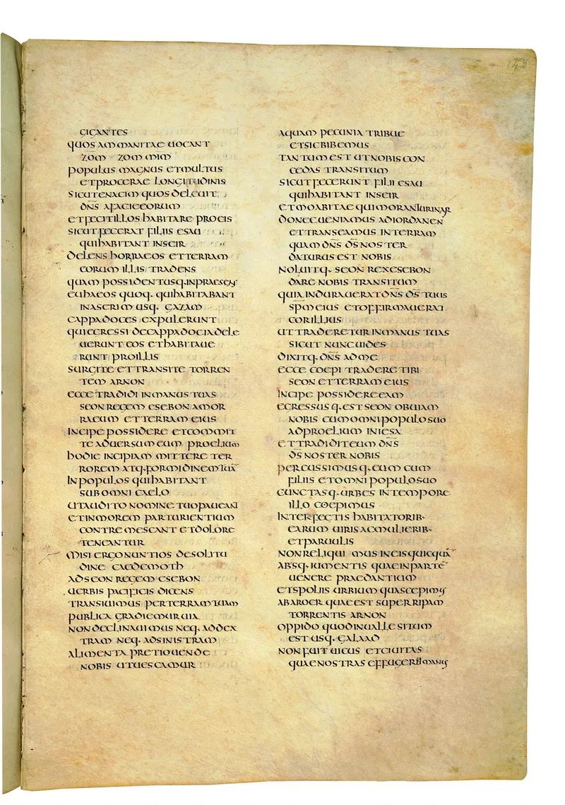 Folio of the Codex Amiatinus, the oldest surviving complete Latin Vulgate manuscript, made c. 700 AD at the twin Northumbrian monasteries of Monkwearmouth and Jarrow under Abbot Ceolfrith. Approximately corresponds to Joshua 1 in Vulgate book order. The page shows the actual eighth-century insular-uncial script as it would have been read by the monks who produced it for Pope Gregory II.