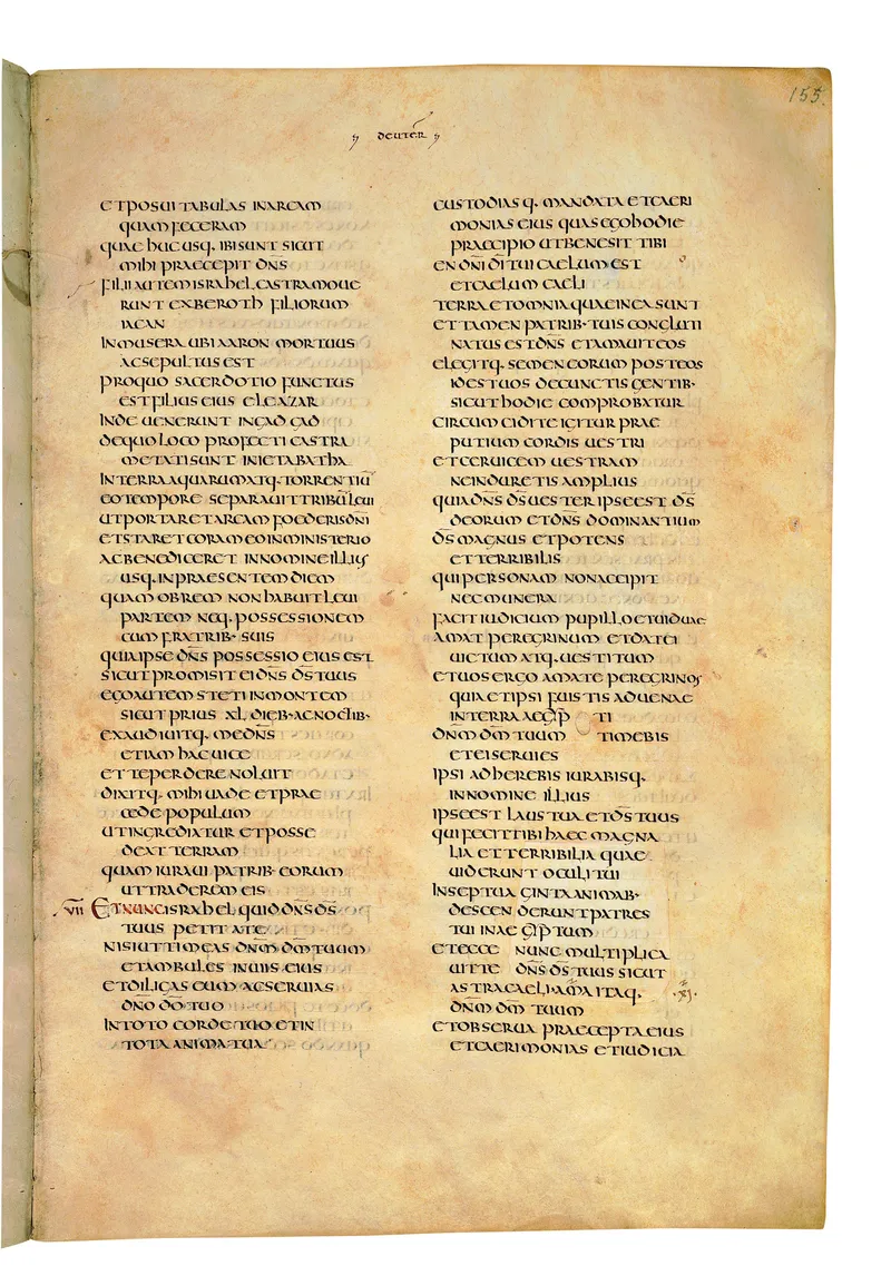 Folio of the Codex Amiatinus, the oldest surviving complete Latin Vulgate manuscript, made c. 700 AD at the twin Northumbrian monasteries of Monkwearmouth and Jarrow under Abbot Ceolfrith. Approximately corresponds to Joshua 10 in Vulgate book order. The page shows the actual eighth-century insular-uncial script as it would have been read by the monks who produced it for Pope Gregory II.