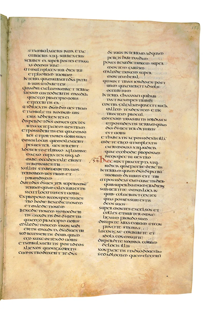 Folio of the Codex Amiatinus, the oldest surviving complete Latin Vulgate manuscript, made c. 700 AD at the twin Northumbrian monasteries of Monkwearmouth and Jarrow under Abbot Ceolfrith. Approximately corresponds to Joshua 11 in Vulgate book order. The page shows the actual eighth-century insular-uncial script as it would have been read by the monks who produced it for Pope Gregory II.