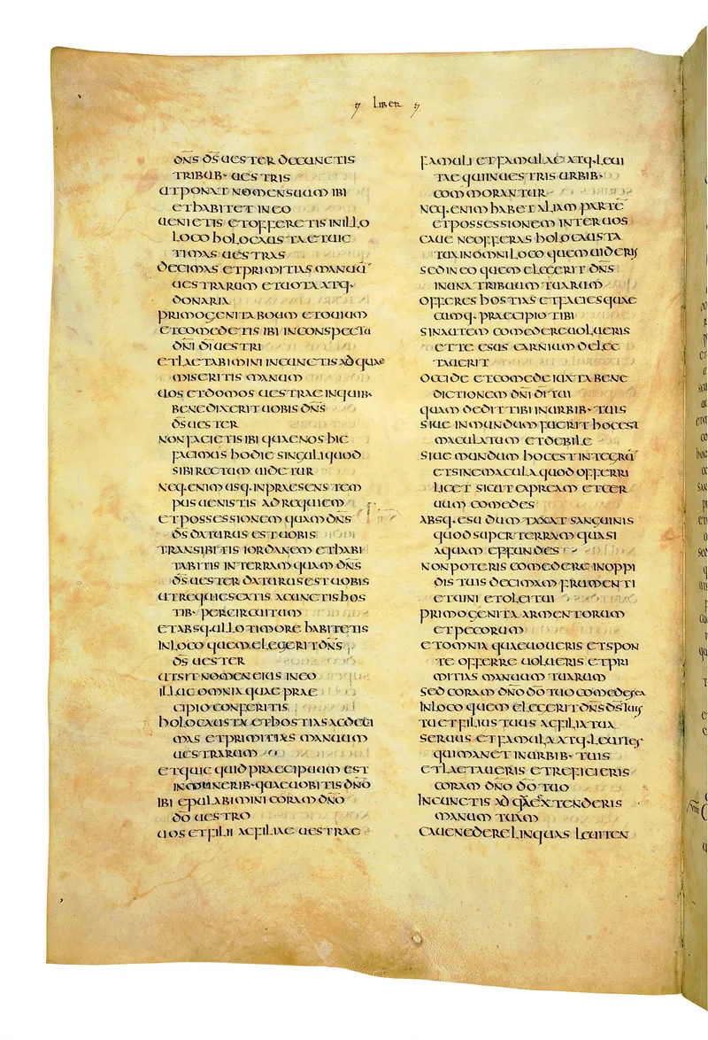 Folio of the Codex Amiatinus, the oldest surviving complete Latin Vulgate manuscript, made c. 700 AD at the twin Northumbrian monasteries of Monkwearmouth and Jarrow under Abbot Ceolfrith. Approximately corresponds to Joshua 12 in Vulgate book order. The page shows the actual eighth-century insular-uncial script as it would have been read by the monks who produced it for Pope Gregory II.
