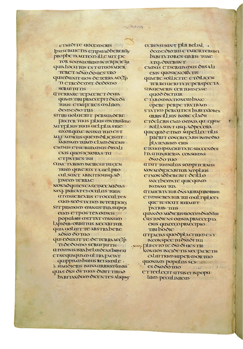 Folio of the Codex Amiatinus, the oldest surviving complete Latin Vulgate manuscript, made c. 700 AD at the twin Northumbrian monasteries of Monkwearmouth and Jarrow under Abbot Ceolfrith. Approximately corresponds to Joshua 13 in Vulgate book order. The page shows the actual eighth-century insular-uncial script as it would have been read by the monks who produced it for Pope Gregory II.