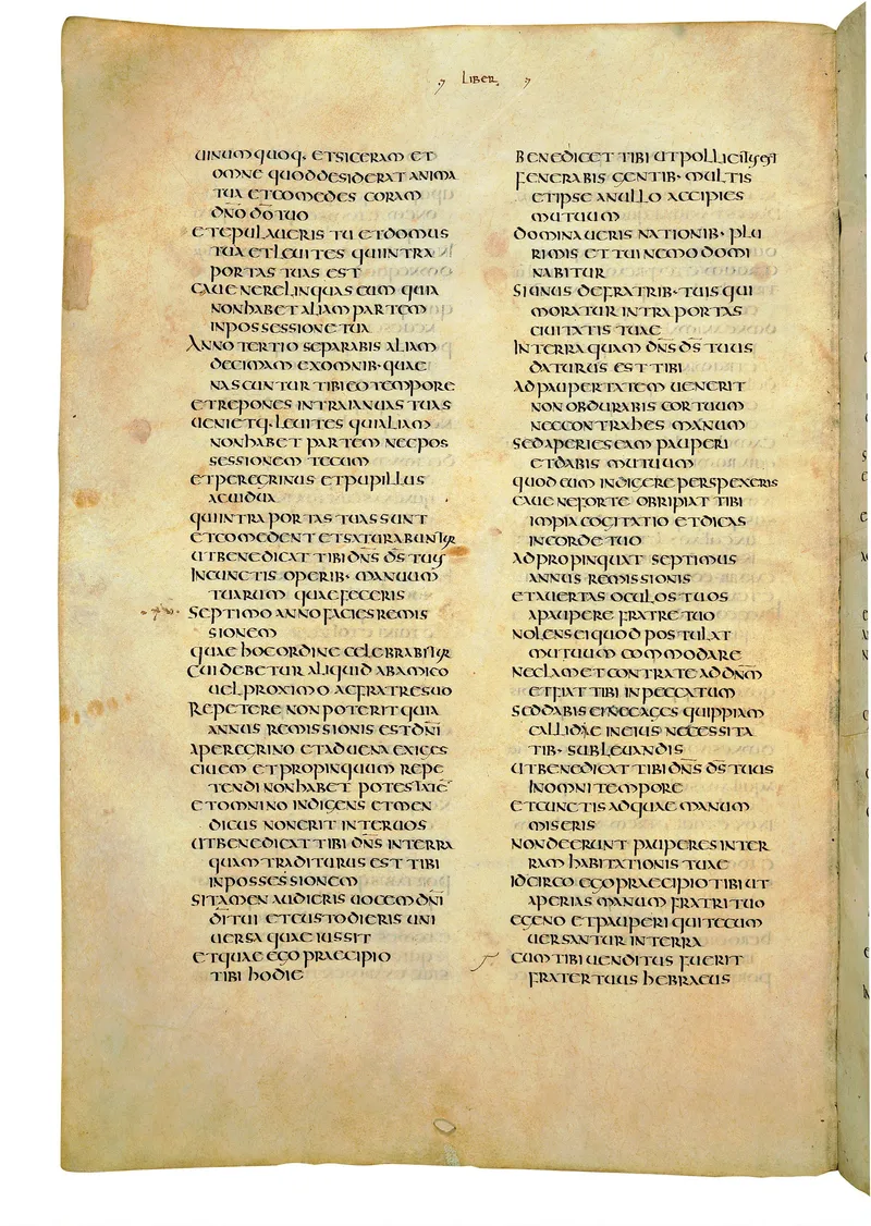 Folio of the Codex Amiatinus, the oldest surviving complete Latin Vulgate manuscript, made c. 700 AD at the twin Northumbrian monasteries of Monkwearmouth and Jarrow under Abbot Ceolfrith. Approximately corresponds to Joshua 14 in Vulgate book order. The page shows the actual eighth-century insular-uncial script as it would have been read by the monks who produced it for Pope Gregory II.