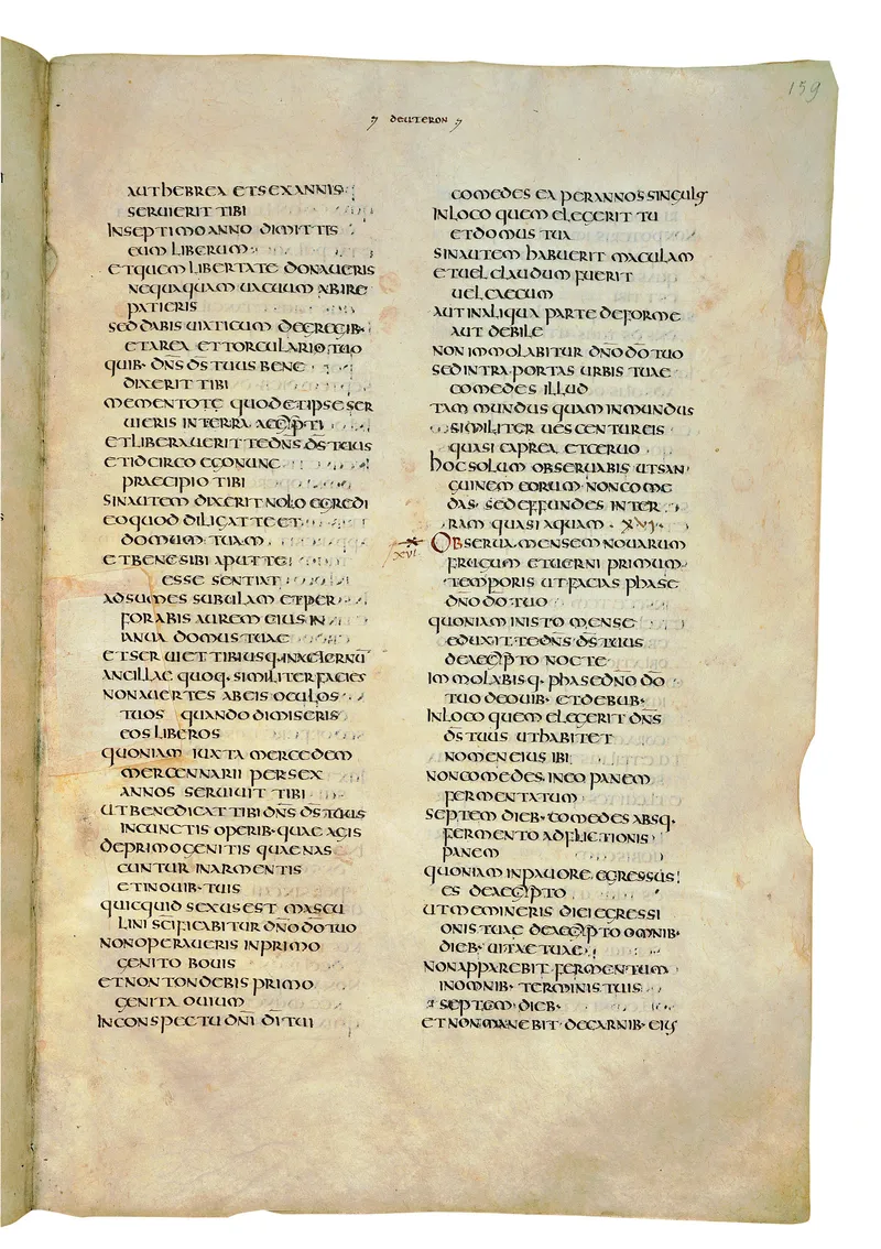 Folio of the Codex Amiatinus, the oldest surviving complete Latin Vulgate manuscript, made c. 700 AD at the twin Northumbrian monasteries of Monkwearmouth and Jarrow under Abbot Ceolfrith. Approximately corresponds to Joshua 15 in Vulgate book order. The page shows the actual eighth-century insular-uncial script as it would have been read by the monks who produced it for Pope Gregory II.