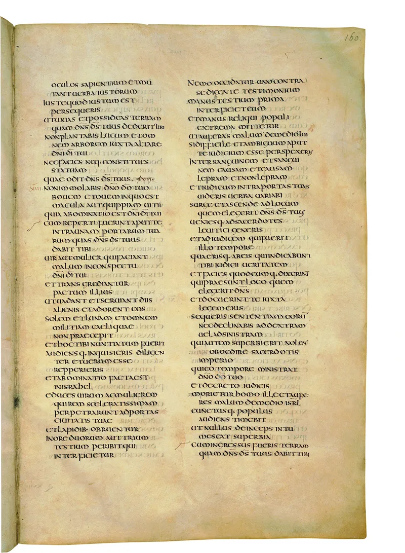 Folio of the Codex Amiatinus, the oldest surviving complete Latin Vulgate manuscript, made c. 700 AD at the twin Northumbrian monasteries of Monkwearmouth and Jarrow under Abbot Ceolfrith. Approximately corresponds to Joshua 16 in Vulgate book order. The page shows the actual eighth-century insular-uncial script as it would have been read by the monks who produced it for Pope Gregory II.