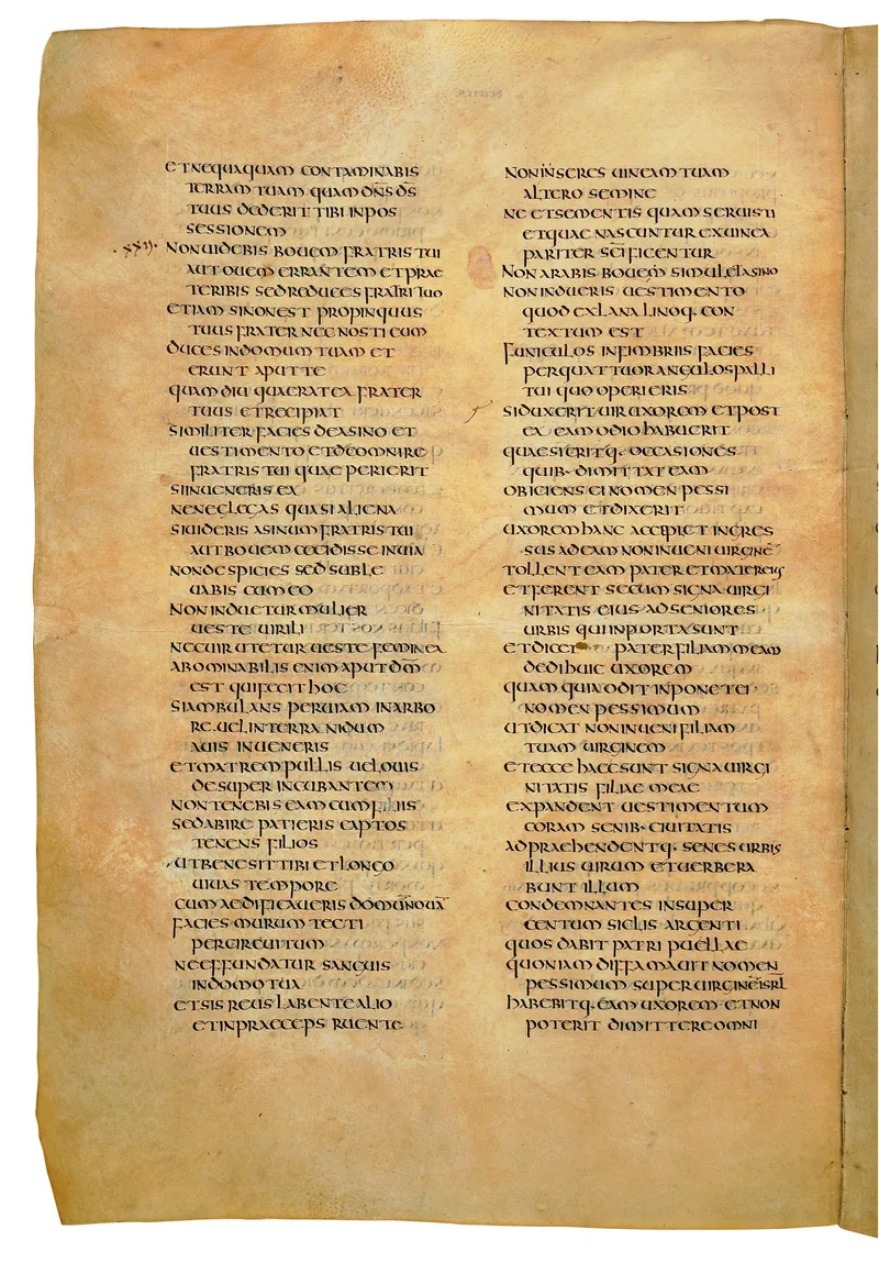 Folio of the Codex Amiatinus, the oldest surviving complete Latin Vulgate manuscript, made c. 700 AD at the twin Northumbrian monasteries of Monkwearmouth and Jarrow under Abbot Ceolfrith. Approximately corresponds to Joshua 21 in Vulgate book order. The page shows the actual eighth-century insular-uncial script as it would have been read by the monks who produced it for Pope Gregory II.