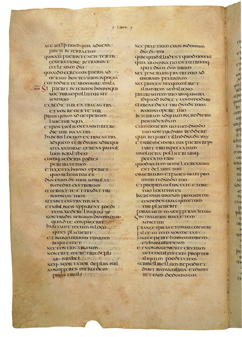 Folio of the Codex Amiatinus, the oldest surviving complete Latin Vulgate manuscript, made c. 700 AD at the twin Northumbrian monasteries of Monkwearmouth and Jarrow under Abbot Ceolfrith. Approximately corresponds to Joshua 22 in Vulgate book order. The page shows the actual eighth-century insular-uncial script as it would have been read by the monks who produced it for Pope Gregory II.