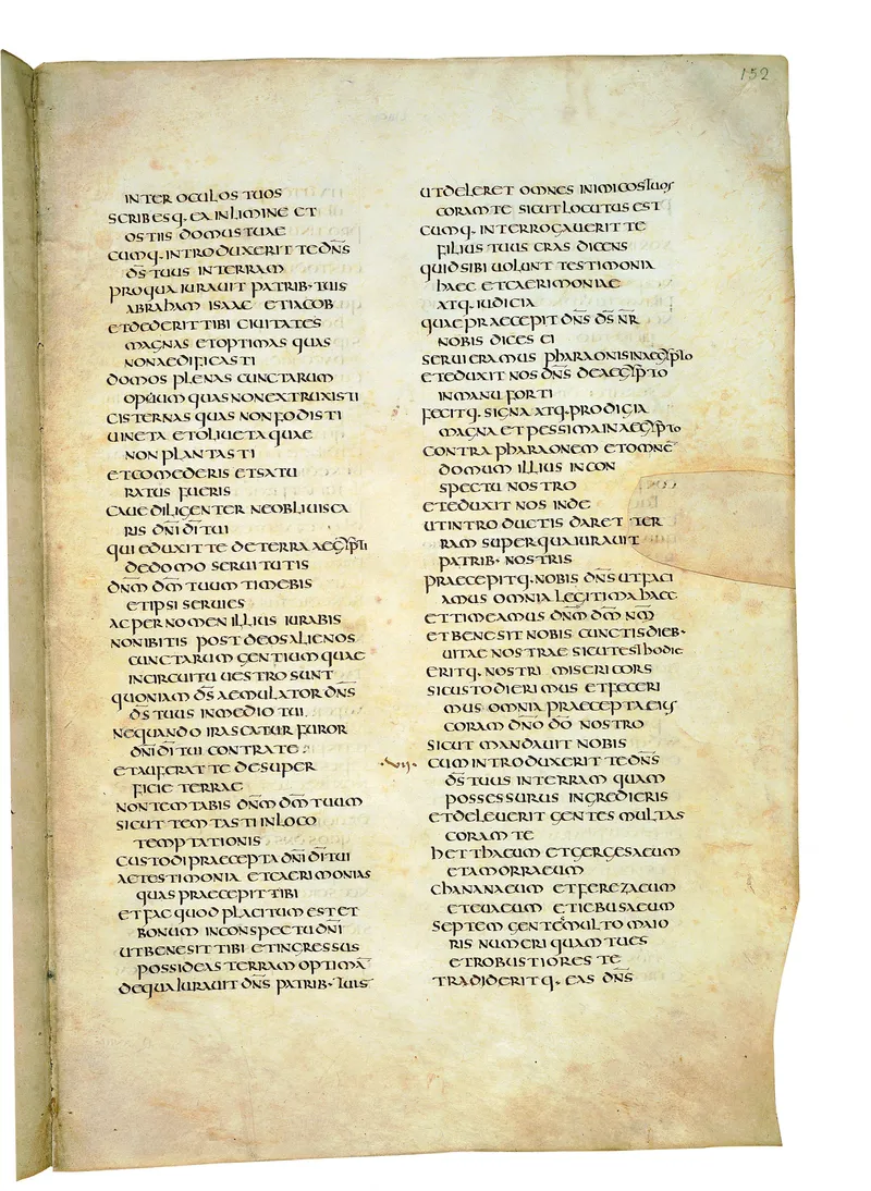 Folio of the Codex Amiatinus, the oldest surviving complete Latin Vulgate manuscript, made c. 700 AD at the twin Northumbrian monasteries of Monkwearmouth and Jarrow under Abbot Ceolfrith. Approximately corresponds to Joshua 6 in Vulgate book order. The page shows the actual eighth-century insular-uncial script as it would have been read by the monks who produced it for Pope Gregory II.