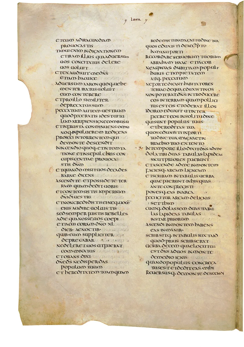 Folio of the Codex Amiatinus, the oldest surviving complete Latin Vulgate manuscript, made c. 700 AD at the twin Northumbrian monasteries of Monkwearmouth and Jarrow under Abbot Ceolfrith. Approximately corresponds to Joshua 9 in Vulgate book order. The page shows the actual eighth-century insular-uncial script as it would have been read by the monks who produced it for Pope Gregory II.