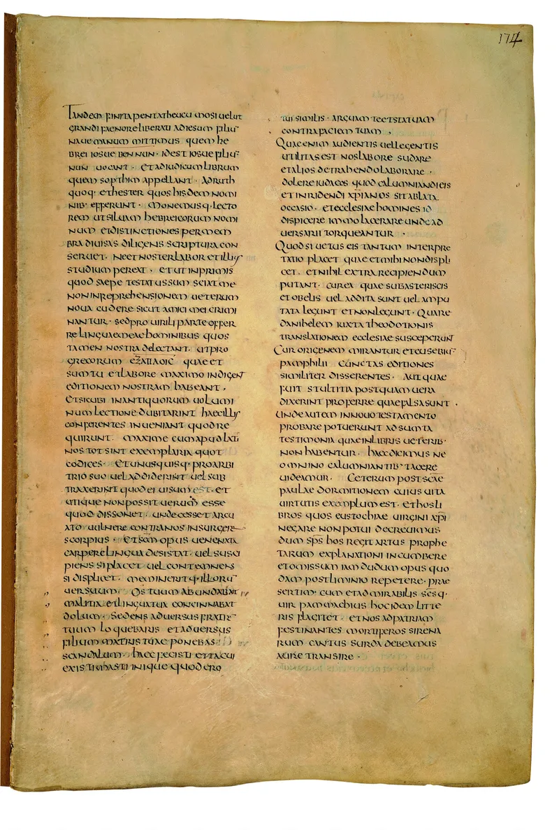 Folio of the Codex Amiatinus, the oldest surviving complete Latin Vulgate manuscript, made c. 700 AD at the twin Northumbrian monasteries of Monkwearmouth and Jarrow under Abbot Ceolfrith. Approximately corresponds to Judges 10 in Vulgate book order. The page shows the actual eighth-century insular-uncial script as it would have been read by the monks who produced it for Pope Gregory II.