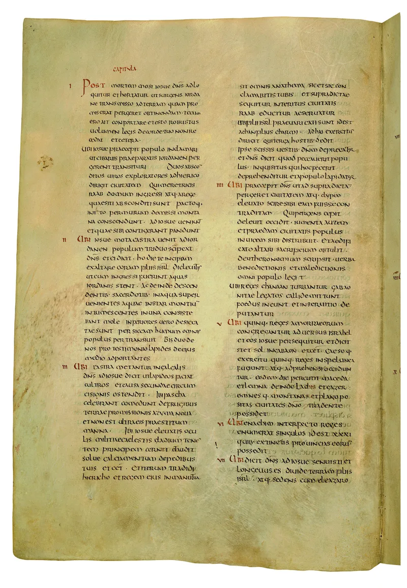 Folio of the Codex Amiatinus, the oldest surviving complete Latin Vulgate manuscript, made c. 700 AD at the twin Northumbrian monasteries of Monkwearmouth and Jarrow under Abbot Ceolfrith. Approximately corresponds to Judges 11 in Vulgate book order. The page shows the actual eighth-century insular-uncial script as it would have been read by the monks who produced it for Pope Gregory II.