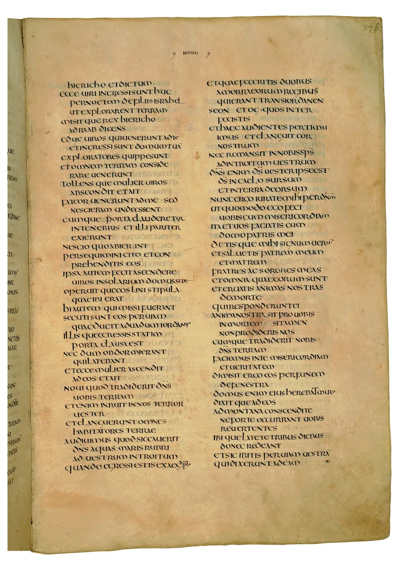 Folio of the Codex Amiatinus, the oldest surviving complete Latin Vulgate manuscript, made c. 700 AD at the twin Northumbrian monasteries of Monkwearmouth and Jarrow under Abbot Ceolfrith. Approximately corresponds to Judges 13 in Vulgate book order. The page shows the actual eighth-century insular-uncial script as it would have been read by the monks who produced it for Pope Gregory II.