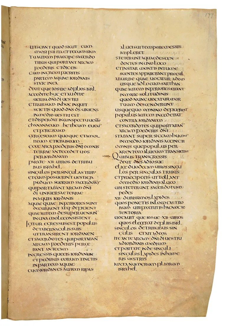 Folio of the Codex Amiatinus, the oldest surviving complete Latin Vulgate manuscript, made c. 700 AD at the twin Northumbrian monasteries of Monkwearmouth and Jarrow under Abbot Ceolfrith. Approximately corresponds to Judges 14 in Vulgate book order. The page shows the actual eighth-century insular-uncial script as it would have been read by the monks who produced it for Pope Gregory II.
