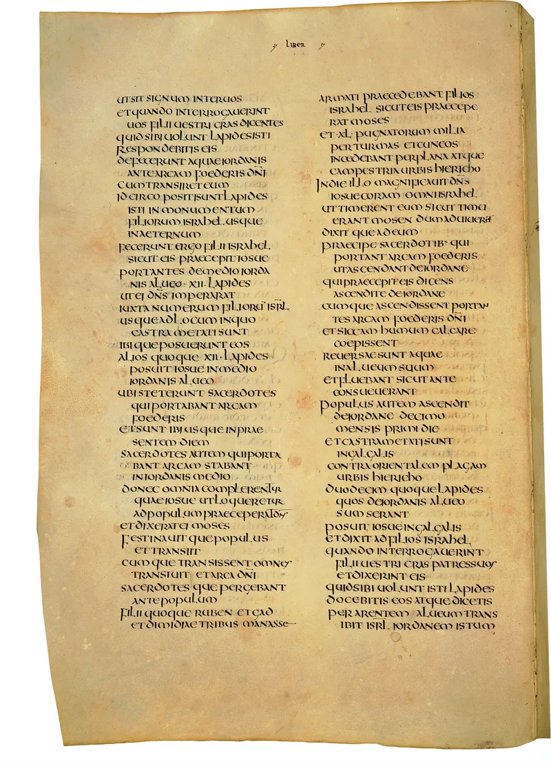 Folio of the Codex Amiatinus, the oldest surviving complete Latin Vulgate manuscript, made c. 700 AD at the twin Northumbrian monasteries of Monkwearmouth and Jarrow under Abbot Ceolfrith. Approximately corresponds to Judges 15 in Vulgate book order. The page shows the actual eighth-century insular-uncial script as it would have been read by the monks who produced it for Pope Gregory II.