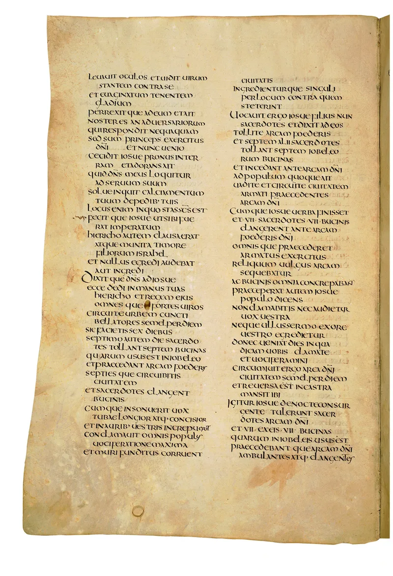 Folio of the Codex Amiatinus, the oldest surviving complete Latin Vulgate manuscript, made c. 700 AD at the twin Northumbrian monasteries of Monkwearmouth and Jarrow under Abbot Ceolfrith. Approximately corresponds to Judges 16 in Vulgate book order. The page shows the actual eighth-century insular-uncial script as it would have been read by the monks who produced it for Pope Gregory II.
