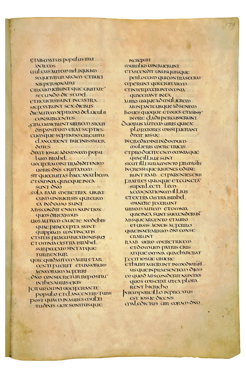 Folio of the Codex Amiatinus, the oldest surviving complete Latin Vulgate manuscript, made c. 700 AD at the twin Northumbrian monasteries of Monkwearmouth and Jarrow under Abbot Ceolfrith. Approximately corresponds to Judges 17 in Vulgate book order. The page shows the actual eighth-century insular-uncial script as it would have been read by the monks who produced it for Pope Gregory II.