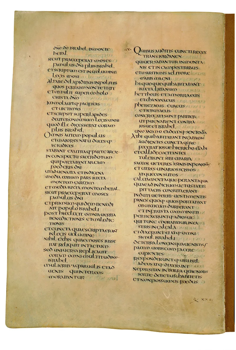 Folio of the Codex Amiatinus, the oldest surviving complete Latin Vulgate manuscript, made c. 700 AD at the twin Northumbrian monasteries of Monkwearmouth and Jarrow under Abbot Ceolfrith. Approximately corresponds to Judges 20 in Vulgate book order. The page shows the actual eighth-century insular-uncial script as it would have been read by the monks who produced it for Pope Gregory II.
