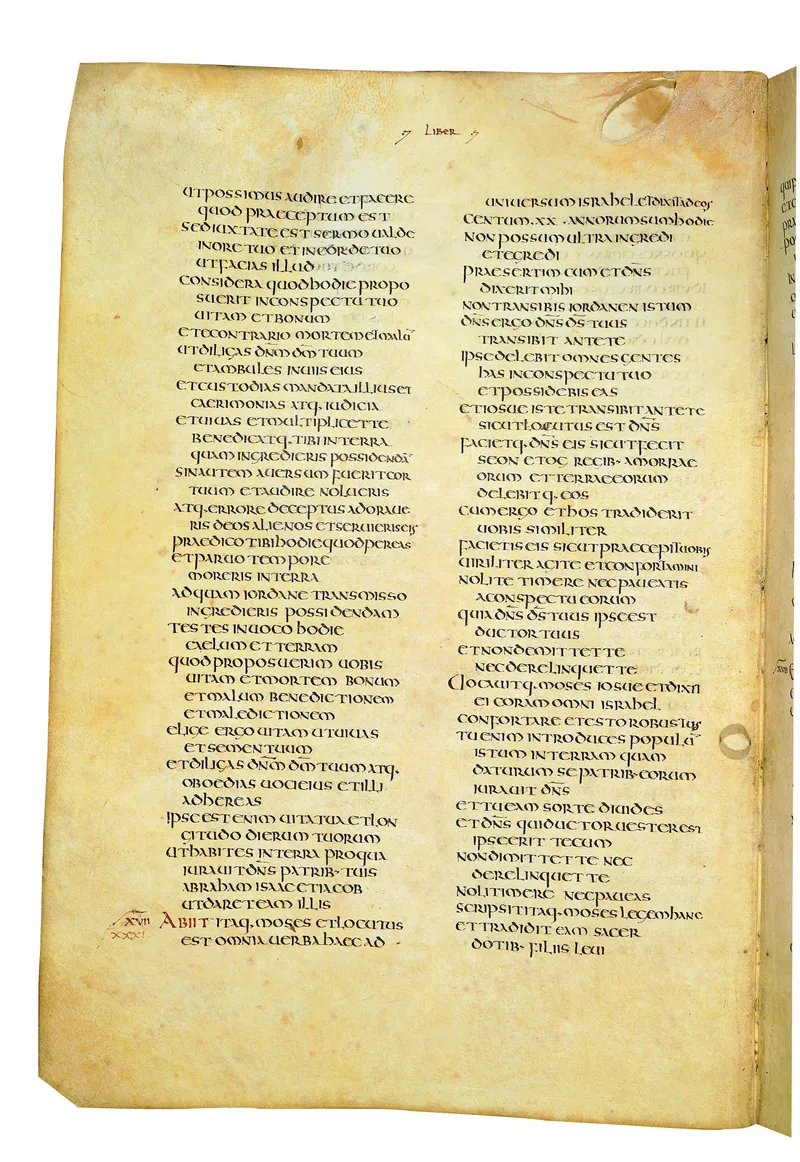 Folio of the Codex Amiatinus, the oldest surviving complete Latin Vulgate manuscript, made c. 700 AD at the twin Northumbrian monasteries of Monkwearmouth and Jarrow under Abbot Ceolfrith. Approximately corresponds to Judges 6 in Vulgate book order. The page shows the actual eighth-century insular-uncial script as it would have been read by the monks who produced it for Pope Gregory II.