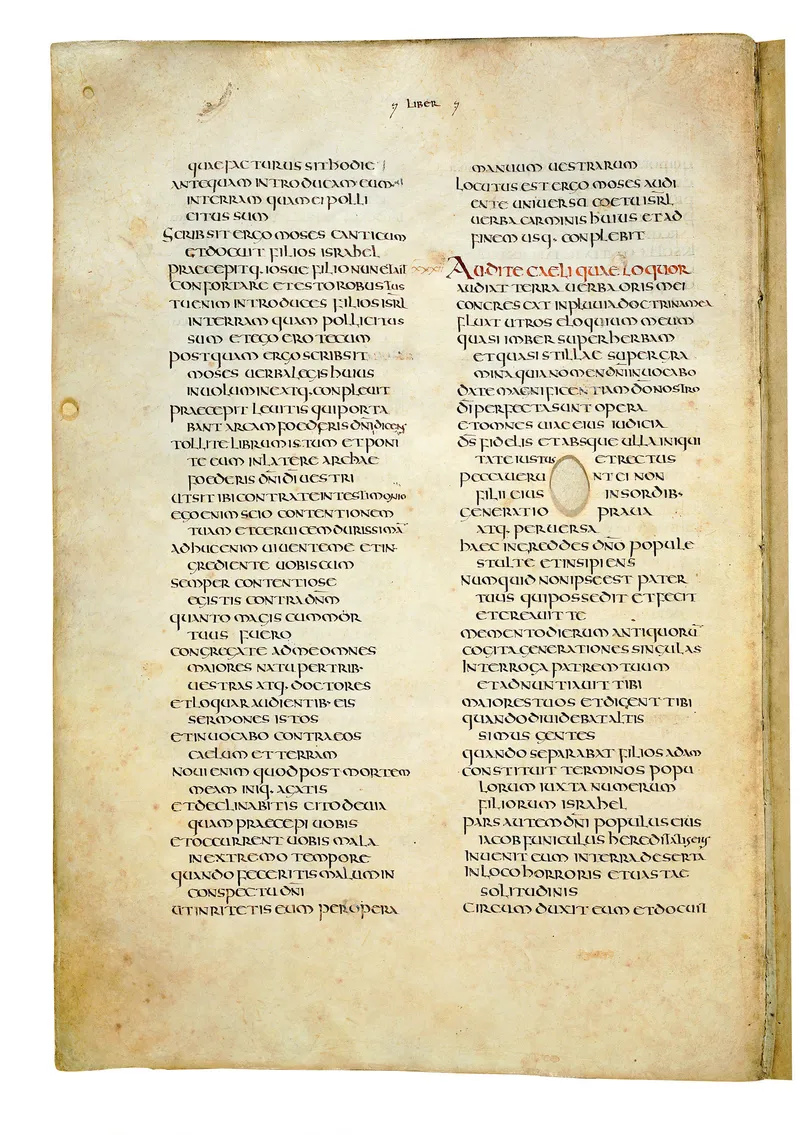 Folio of the Codex Amiatinus, the oldest surviving complete Latin Vulgate manuscript, made c. 700 AD at the twin Northumbrian monasteries of Monkwearmouth and Jarrow under Abbot Ceolfrith. Approximately corresponds to Judges 7 in Vulgate book order. The page shows the actual eighth-century insular-uncial script as it would have been read by the monks who produced it for Pope Gregory II.
