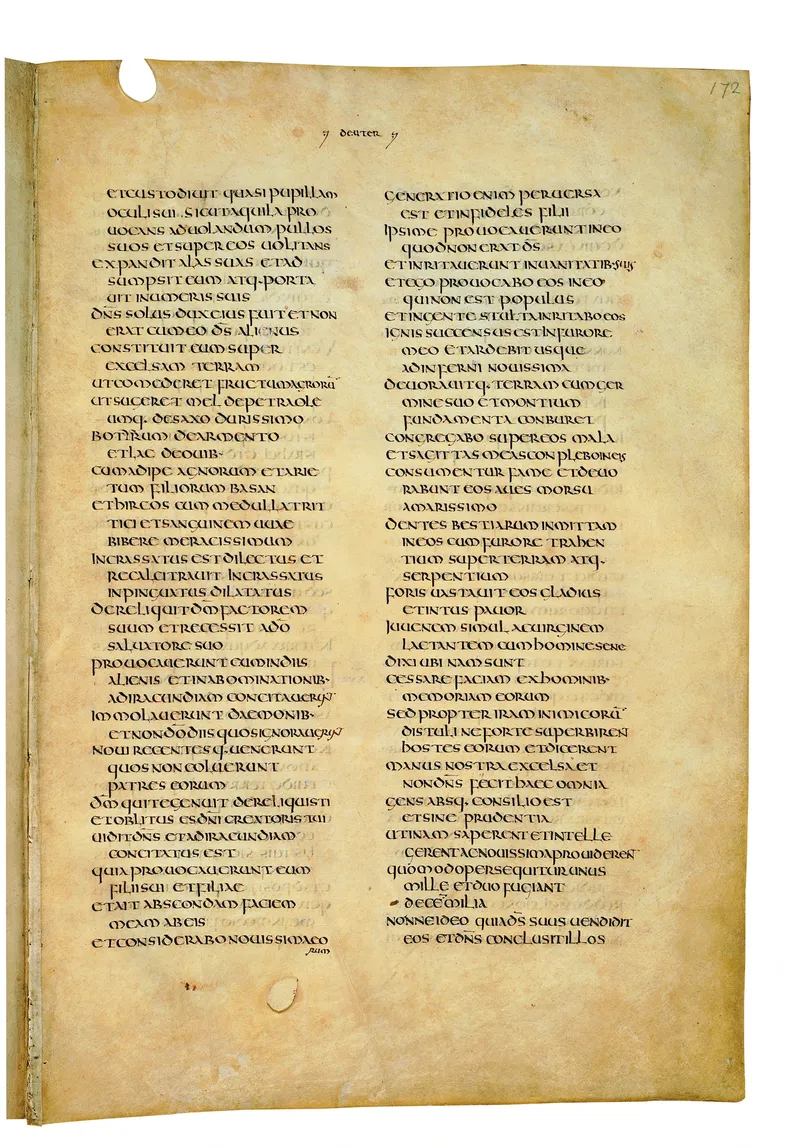 Folio of the Codex Amiatinus, the oldest surviving complete Latin Vulgate manuscript, made c. 700 AD at the twin Northumbrian monasteries of Monkwearmouth and Jarrow under Abbot Ceolfrith. Approximately corresponds to Judges 8 in Vulgate book order. The page shows the actual eighth-century insular-uncial script as it would have been read by the monks who produced it for Pope Gregory II.