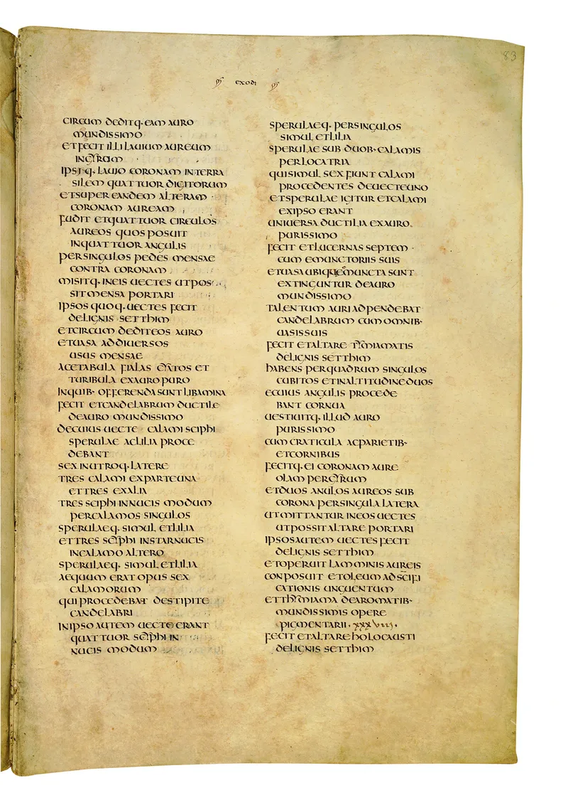 Folio of the Codex Amiatinus, the oldest surviving complete Latin Vulgate manuscript, made c. 700 AD at the twin Northumbrian monasteries of Monkwearmouth and Jarrow under Abbot Ceolfrith. Approximately corresponds to Leviticus 14 in Vulgate book order. The page shows the actual eighth-century insular-uncial script as it would have been read by the monks who produced it for Pope Gregory II.