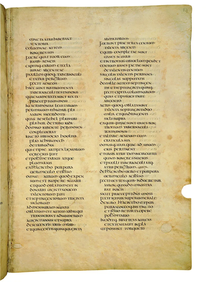 Folio of the Codex Amiatinus, the oldest surviving complete Latin Vulgate manuscript, made c. 700 AD at the twin Northumbrian monasteries of Monkwearmouth and Jarrow under Abbot Ceolfrith. Approximately corresponds to Leviticus 15 in Vulgate book order. The page shows the actual eighth-century insular-uncial script as it would have been read by the monks who produced it for Pope Gregory II.
