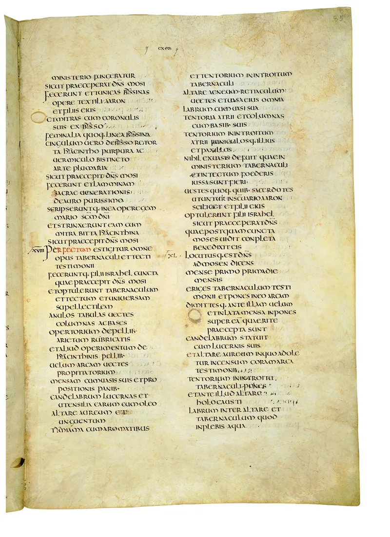 Folio of the Codex Amiatinus, the oldest surviving complete Latin Vulgate manuscript, made c. 700 AD at the twin Northumbrian monasteries of Monkwearmouth and Jarrow under Abbot Ceolfrith. Approximately corresponds to Leviticus 16 in Vulgate book order. The page shows the actual eighth-century insular-uncial script as it would have been read by the monks who produced it for Pope Gregory II.