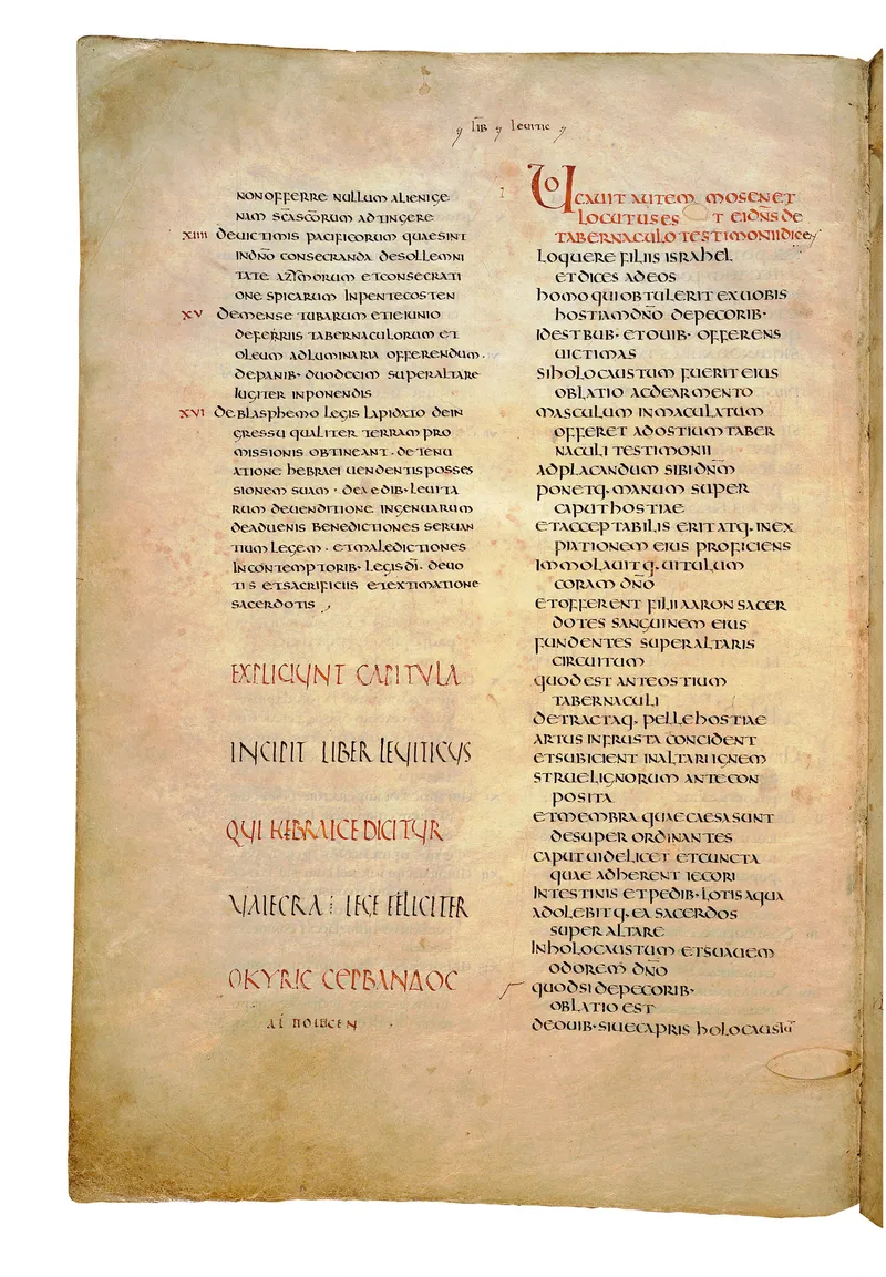 Folio of the Codex Amiatinus, the oldest surviving complete Latin Vulgate manuscript, made c. 700 AD at the twin Northumbrian monasteries of Monkwearmouth and Jarrow under Abbot Ceolfrith. Approximately corresponds to Leviticus 18 in Vulgate book order. The page shows the actual eighth-century insular-uncial script as it would have been read by the monks who produced it for Pope Gregory II.