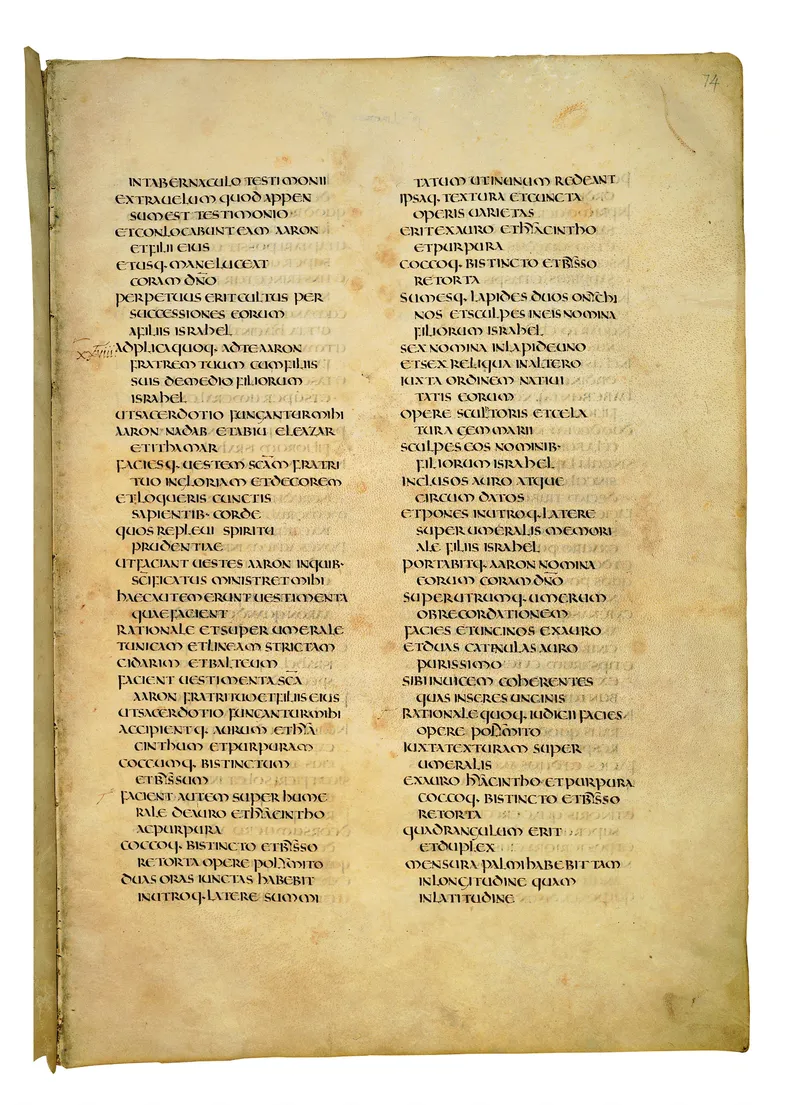 Folio of the Codex Amiatinus, the oldest surviving complete Latin Vulgate manuscript, made c. 700 AD at the twin Northumbrian monasteries of Monkwearmouth and Jarrow under Abbot Ceolfrith. Approximately corresponds to Leviticus 2 in Vulgate book order. The page shows the actual eighth-century insular-uncial script as it would have been read by the monks who produced it for Pope Gregory II.