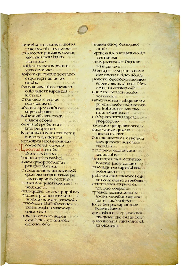 Folio of the Codex Amiatinus, the oldest surviving complete Latin Vulgate manuscript, made c. 700 AD at the twin Northumbrian monasteries of Monkwearmouth and Jarrow under Abbot Ceolfrith. Approximately corresponds to Leviticus 20 in Vulgate book order. The page shows the actual eighth-century insular-uncial script as it would have been read by the monks who produced it for Pope Gregory II.
