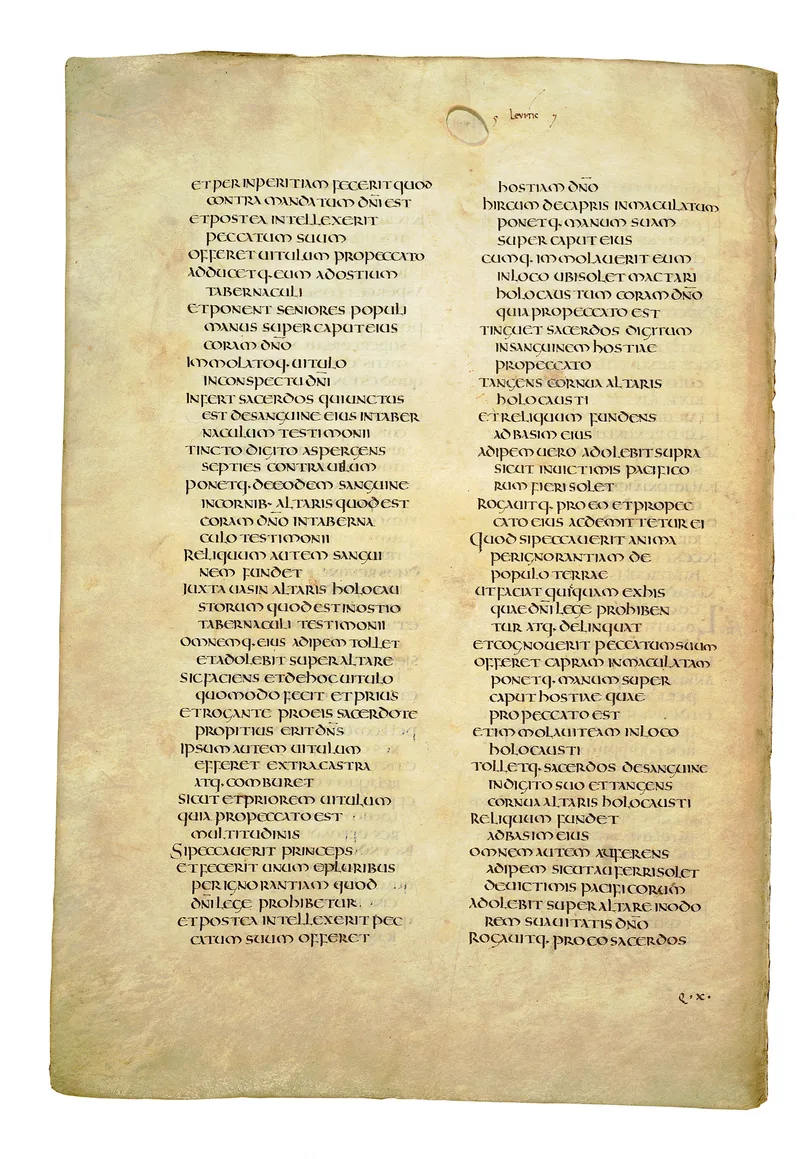 Folio of the Codex Amiatinus, the oldest surviving complete Latin Vulgate manuscript, made c. 700 AD at the twin Northumbrian monasteries of Monkwearmouth and Jarrow under Abbot Ceolfrith. Approximately corresponds to Leviticus 21 in Vulgate book order. The page shows the actual eighth-century insular-uncial script as it would have been read by the monks who produced it for Pope Gregory II.