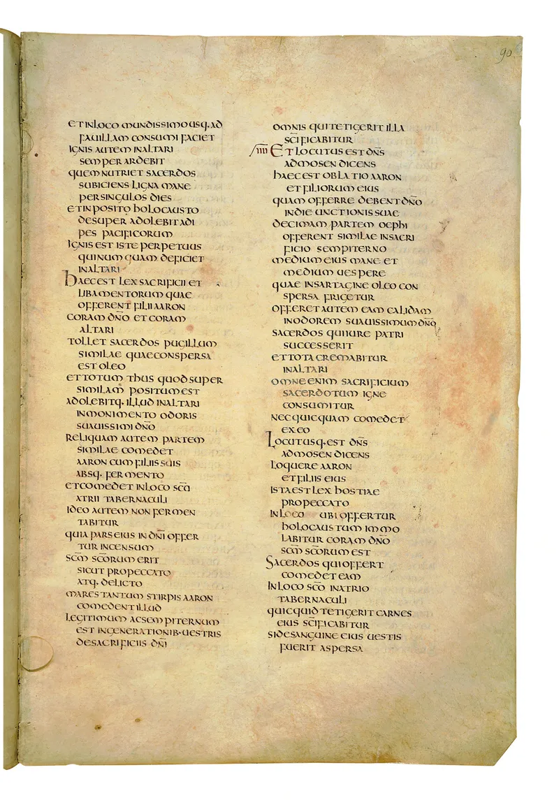Folio of the Codex Amiatinus, the oldest surviving complete Latin Vulgate manuscript, made c. 700 AD at the twin Northumbrian monasteries of Monkwearmouth and Jarrow under Abbot Ceolfrith. Approximately corresponds to Leviticus 23 in Vulgate book order. The page shows the actual eighth-century insular-uncial script as it would have been read by the monks who produced it for Pope Gregory II.