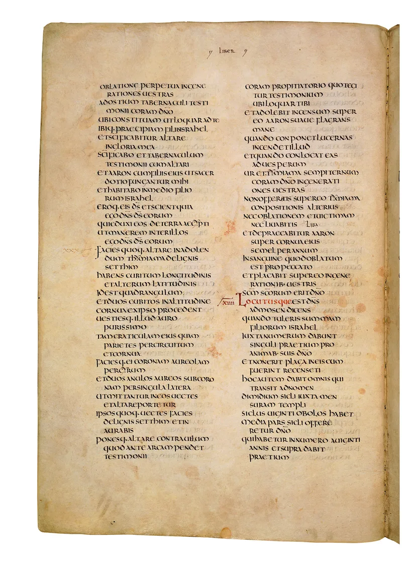 Folio of the Codex Amiatinus, the oldest surviving complete Latin Vulgate manuscript, made c. 700 AD at the twin Northumbrian monasteries of Monkwearmouth and Jarrow under Abbot Ceolfrith. Approximately corresponds to Leviticus 5 in Vulgate book order. The page shows the actual eighth-century insular-uncial script as it would have been read by the monks who produced it for Pope Gregory II.