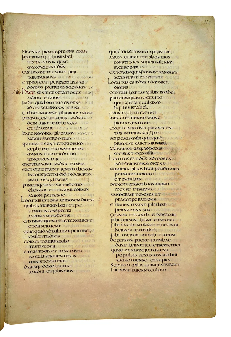 Folio of the Codex Amiatinus, the oldest surviving complete Latin Vulgate manuscript, made c. 700 AD at the twin Northumbrian monasteries of Monkwearmouth and Jarrow under Abbot Ceolfrith. Approximately corresponds to Numbers 27 in Vulgate book order. The page shows the actual eighth-century insular-uncial script as it would have been read by the monks who produced it for Pope Gregory II.